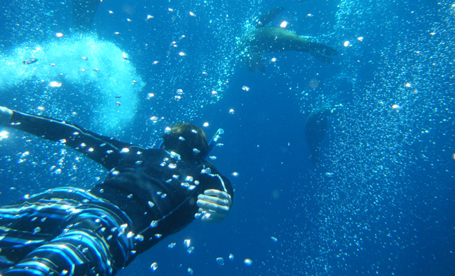 Immediately I’m surrounded by dozens of inquisitive seals, many of whom race towards me before darting off to the side at the last minute. Their agility in the water is astonishing and I flail around hopelessly in an effort to keep up. In the end I float on the surface and enjoy the show as they spin, twirl and dive among streams of air bubbles.